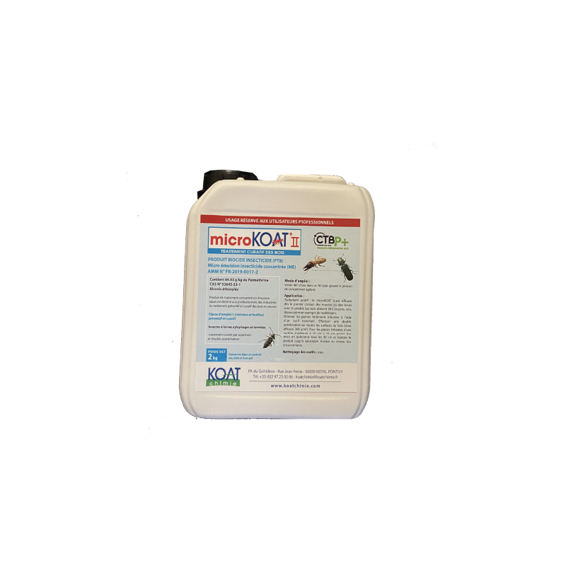 Microkoat bidon de 2L – insecticide concentrée destinée aux traitements préventifs et curatifs des bois. Efficace contre les insectes à larves xylophages (capricorne, vrillette…) et les termites, il s’utilise sur charpentes, poutres, solivages, ossatures et panneaux bois dans les traitements professionnels du bois. Certifié CTB-P+ et AMM ANSES, il garantit une protection durable des structures bois.